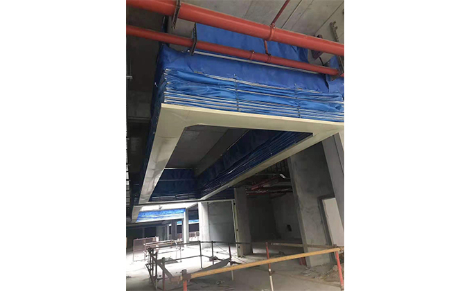 擋煙垂簾垂壁根據設計要求和現場實際情況采取如下施工順序:首先,搭設腳手架一放線一打眼--上脹栓一焊骨架。第二,吊件一安裝骨架…
